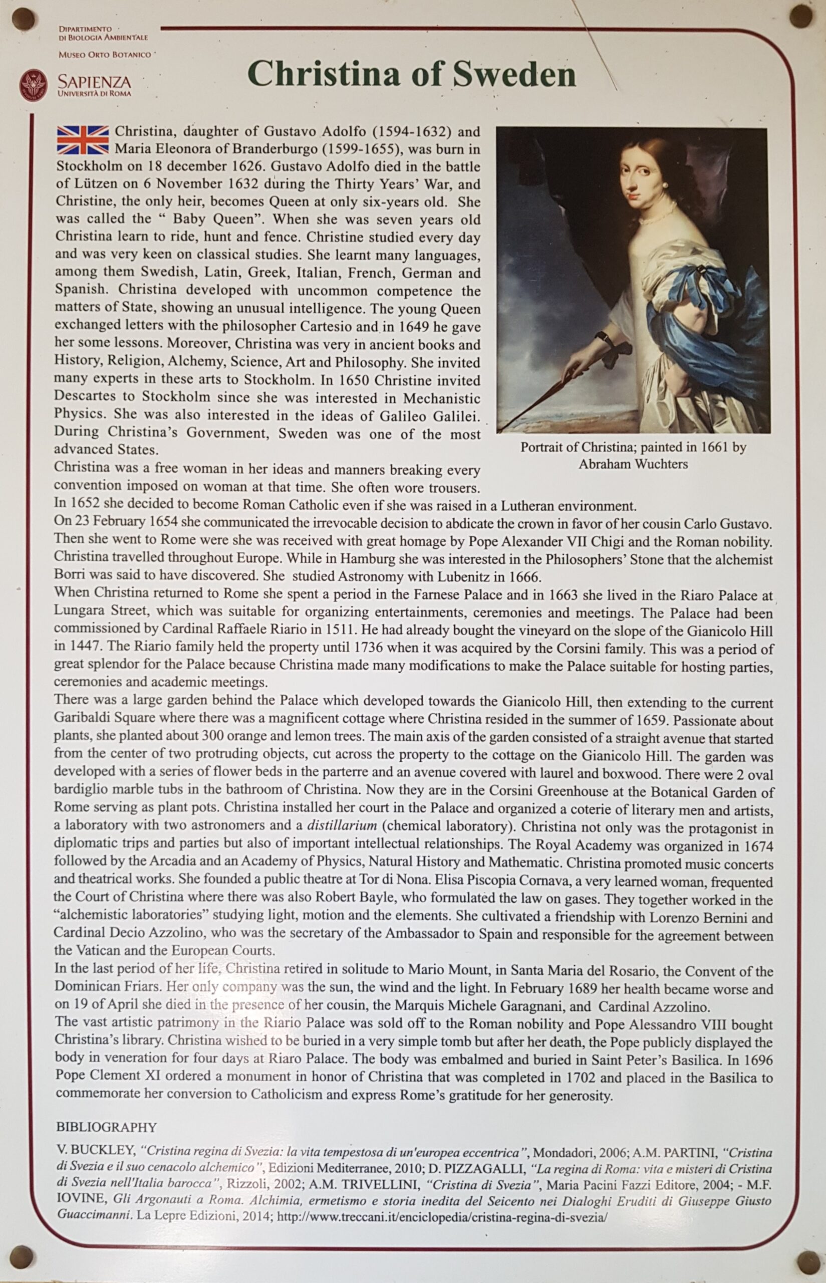 L’un de ces lieux était l’Academia dei Lincei (Académie des Lyncéens). Il s’agit d’une institution scientifique prestigieuse, considérée comme la plus ancienne du monde, située dans le palais Corsini, dans le quartier du Trastevere. Par une étrange coïncidence, nous avons découvert que le jardin botanique de Rome, un endroit que mon autre sœur, fleuriste, avait exprimé le souhait de visiter, se trouvait dans le jardin du même palais. J’ai également appris que c’est à cet endroit que la reine Christine de Suède avait installé son « Académie d’Arcadie » après son abdication du trône suédois en 1654. [1]