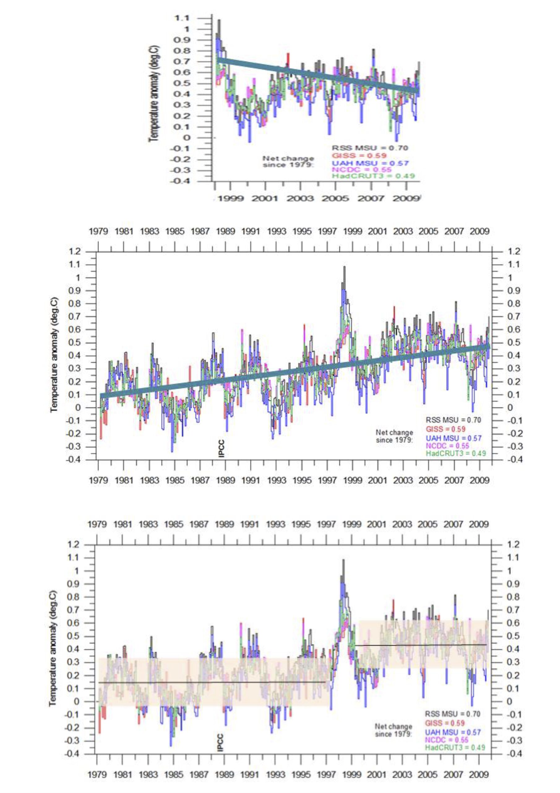 Henri Masson (2023A198), par exemple, critique la méthode qui consiste à réduire une série temporelle de mesures à des droites de régression. Le simple choix de l’intervalle temporel permet d’en modifier la pente, et donc la signification en termes d’augmentation ou de diminution. Sur l’image ci-contre (données issues de Climate4you), la régression linéaire des températures de 1979 à 2009 ferait apparaître un réchauffement global alors que, de 1998 à 2009, on assisterait à un refroidissement. En divisant l’intervalle en deux sections, on peut faire apparaître une absence de variation entre 1979 et 1997, ainsi qu’entre 1999 et 2009, avec un saut de 0.3 degrés en 1997–1998, résultat d’un événement El NiñoN17. Aucune de ces trois représentations n’est réaliste…