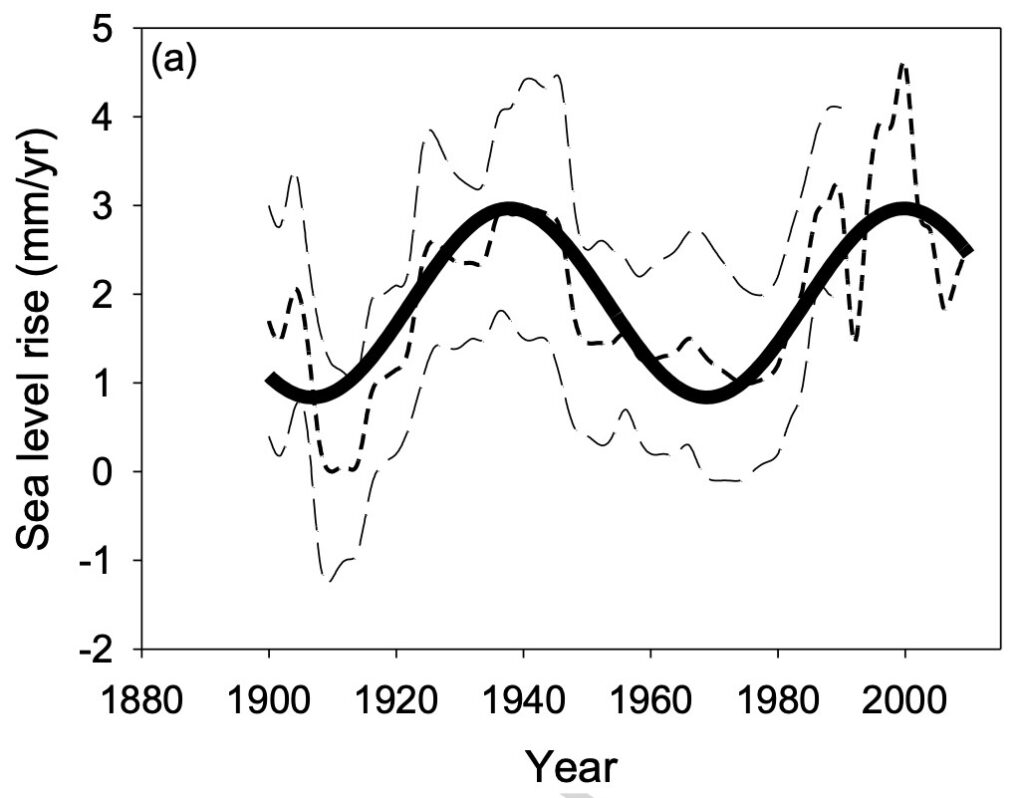 Une méthode plus pertinente d’analyse d’une série temporelle consiste à rechercher en premier lieu des composantes périodiques en faisant appel à la transformée de Fourier de la fonction d’autocorrélation (Masson H, 2023A198 figure 28). Dans l’exemple considéré, quatre composantes présentent une magnitude supérieure à la composante continue (fréquence zéro) qui est de 0.15° C. On peut donc réduire la série à une somme de quatre sinusoïdes et une composante continue. La courbe en rouge, ci-dessous, dont la période est d’une soixantaine d’années, pourrait être la trace d’une oscillation climatique — voir ci-dessous.