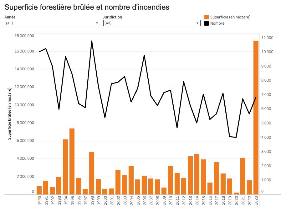- N64 · r73p · Superficie forestière brûlée et nombre d’incendies (Canada)