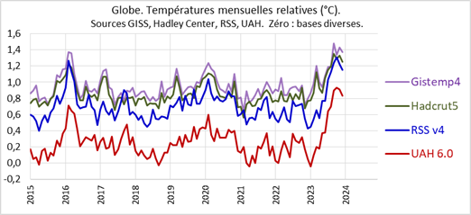 Les perturbations (cycles irréguliers) dans la circulation atmosphérique El NiñoN17 et La NiñaN18 échappent aux modèles prédictifs, bien qu’elles aient une influence considérable sur les variations saisonnières de température. El Niño provoque un échauffement, alors que La Niña provoque un refroidissement, mais avec des effets qui peuvent être radicalement différents selon les parties du globe, par exemple une sécheresse au Sahel en même temps que des pluies diluviennes au Brésil (Troude M, 2024A333). Il est fréquent d’entendre les climatologues admettre qu’ils sont des acteurs significatifs des variations climatiques, tout en ajoutant (sans l’ombre d’une preuve) que ces phénomènes sont « aggravés » par la production de gaz à effet de serre…