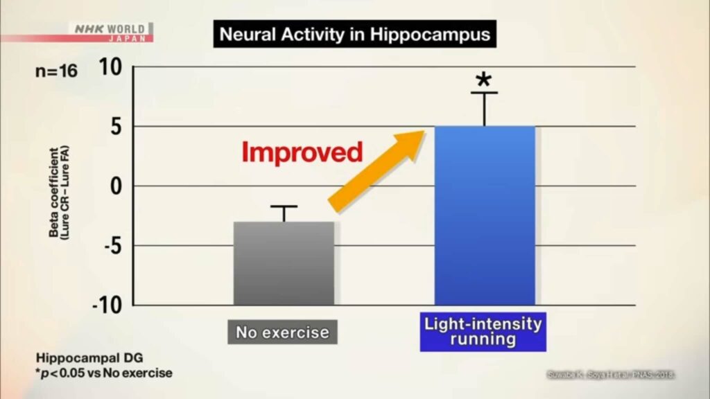 La course lente (light-intensity running) proposée par Hideaki Soya est un complément intéressant de la marche fractionnée. Elle améliore les fonctions cognitives et retarde leur déclin avec l’âge. Alors que, dans la marche, un pied au moins est en contact avec le sol, la course inclut un soulèvement simultané des deux pieds. Voir cette partie de la vidéo publiée par le NHK pour bien assimiler la notion de lenteur.