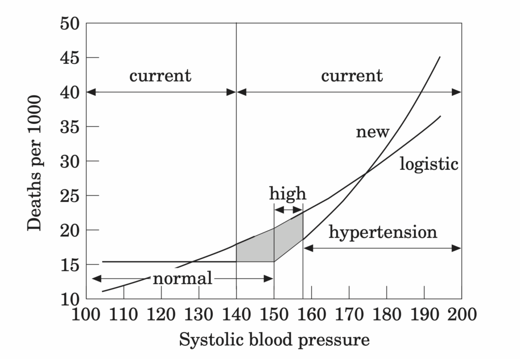 De manière arbitraire, un seuil était annoncé à partir duquel un traitement contre l’hypertension s’imposerait. Pour les personnes âgées, aux États-Unis, il était de 160 mmHg jusqu’en 1988, puis de 140 jusqu’en 2003, et 130 par la suite, avec un rebond inexpliqué à 140 en 2014.